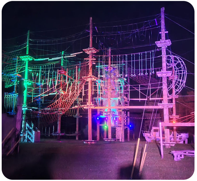 This aerial course lets everyone be on the structure at the same time. Unlike a traditional tree-to-tree ropes course, you choose where you want to go, which elements you want to do, and how high you want to climb. There are 70 modules across 4 height levels, plus a large double zip line and a climbing pole. The activity is also available at night.Main restrictions: